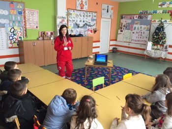 Како подарок по повод неделата за промоција на денталната хигиена, сите ученици – посетители на предавањето од Црвен крст на град Скопје добија четкичка за заби.