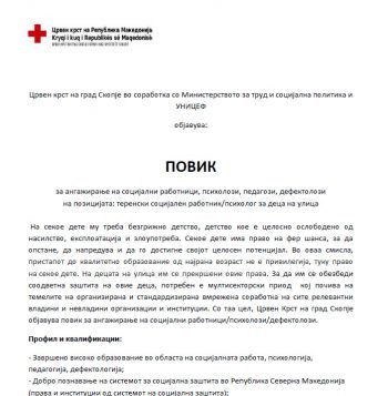ПОВИК за ангажирање на социјални работници, психолози, педагози, дефектолози на позицијата: теренски социјален работник/психолог за деца на улица