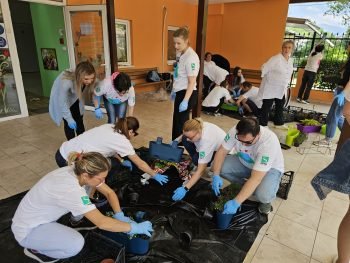Корисниците од дневниот центар заедно со вработените од Сава осигурување и Сава пензиско друштво садеа цвеќиња за разубавување на дворот.