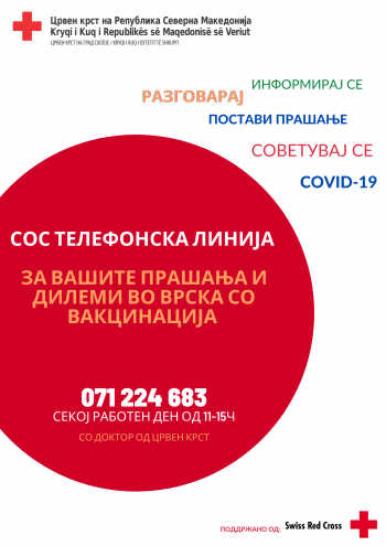 Почнувајќи во месец април, Црвен крст на град Скопје започнува со нови активности за поддршка на населението за превенција од КОВИД-19. Во таа насока, нова сос-линија за сите граѓани заинтересирани да разговараат со доктор од Црвениот крст во врска со прашања и дилеми поврзани со вакцинацијата. Линијата е отворена секој работен ден од понеделник до петок од 11-15ч. Вашите повици на 071/224-683 се добредојдени заеднички да се информираме правилно. Оваа активност е поддржана од страна на Швајцарскиот Црвен крст.