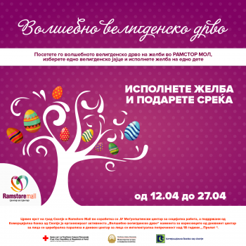 Црвен крст на град Скопје во соработка со ЈУ Меѓуопштински центар за социјална работа и Рамстор Мол по шести пат ја организира активноста Волшебно велигденско дрво. Со цел разубавување на претстојните празници но и многу радост и насмевки истата е наменета за корисниците од дневниот центар за церебрална парализа и центарот за лица со интелектуална попреченост ,,Пролет”. Картичките во форма на јајце се закачени на велигденското дрво кое е поставено на главниот влез во трговскиот , а сите граѓани кои сакаат да допринесат за исполнување на некоја од желбите можат подароците да ги остават на пултот за информации во маркетот Рамстор. Активноста трае до 27.4 , а остварените желби ќе ги достават волонтерите на Црвен крст во центрите кои тие секојдневно ги посетуваат.